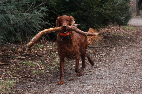 War der Silvesterspaziergang leider komplett "Irish-Setter-los" gewesen, bekamen wir beim "Gnomengang" erfreulicherweise mehrfache feuerrote Verstärkung. Neben Rocca (von Sandra und Uli) und Quincie (von Annett und Axel) schlossen sich uns zum ersten Mal Miriam und Christopher mit ihrem 8-Monate-alten Irish Setter Rüden Cooper an. Der Jungspunt war begeistert von so vielen Rassekollegen, mit denen er herum turnen konnte.